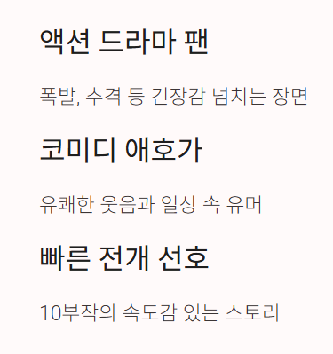 - 추천 대상: 액션 드라마를 좋아하고, 동시에 유머러스한 요소 또한 선호하는 분들께 적합합니다.