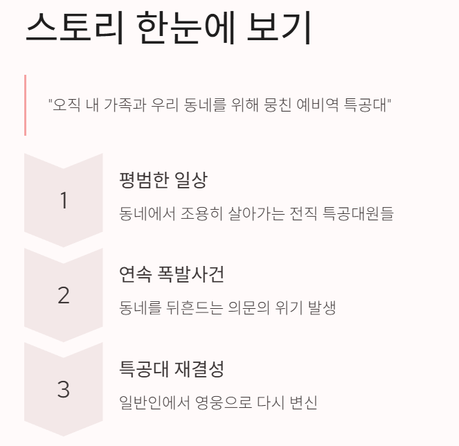 드라마는 “오직 내 가족과 우리 동네를 위해 뭉친 예비역 특공대”라는 설정에서 출발합니다.