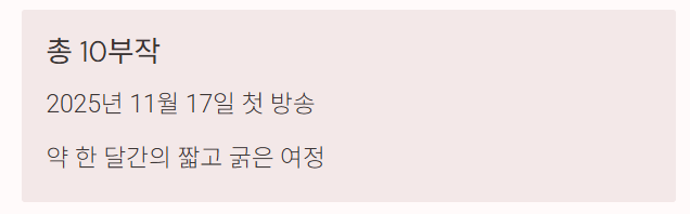 - 주의사항: 에피소드가 총 10부작으로 짧은 편이므로, 전개가 빠르다는 느낌을 받을 수 있으며, 캐릭터 관계 등이 깊게 파고들기엔 분량이 제한적일 수 있습니다.