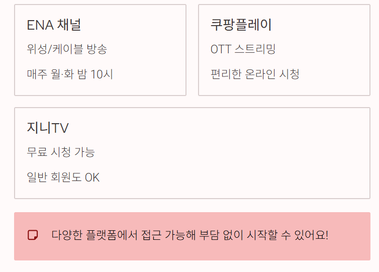 시청 가능 플랫폼으로는 위성/케이블채널 ENA 외에도 OTT 서비스가 포함되어 있는데, 쿠팡플레이와 지니TV에서 제공됩니다.
