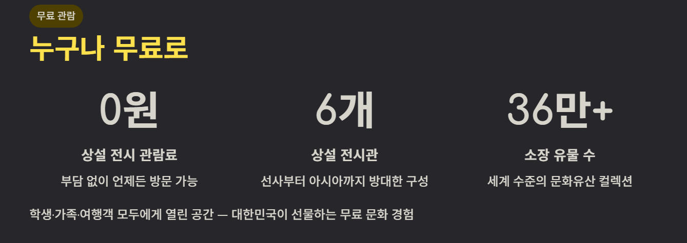 국립중앙박물관의 가장 큰 특징 중 하나는 상설 전시 무료 관람이다. 누구나 부담 없이 방문해 문화유산을 감상할 수 있기 때문에 학생, 가족, 여행객에게 매우 인기 있는 문화 공간이다.