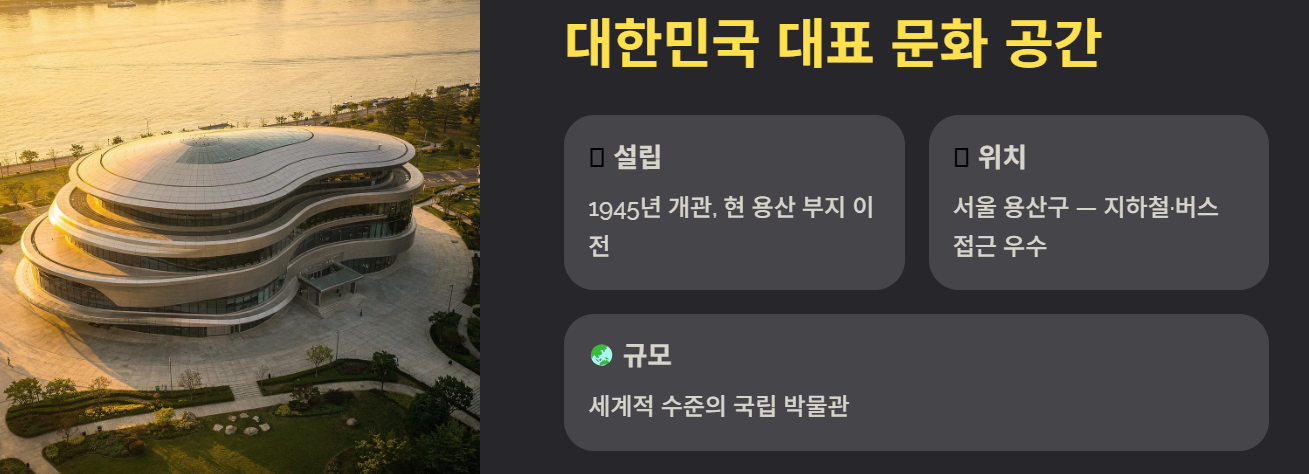 국립중앙박물관은 대한민국을 대표하는 국립 박물관으로 한국 역사와 예술을 종합적으로 보존하고 연구하는 기관이다. 1945년 설립 이후 여러 차례 이전을 거쳐 현재의 용산 부지에 자리 잡았다. 규모 또한 세계적인 수준으로 알려져 있으며, 다양한 문화재와 유물을 체계적으로 전시하고 있다.