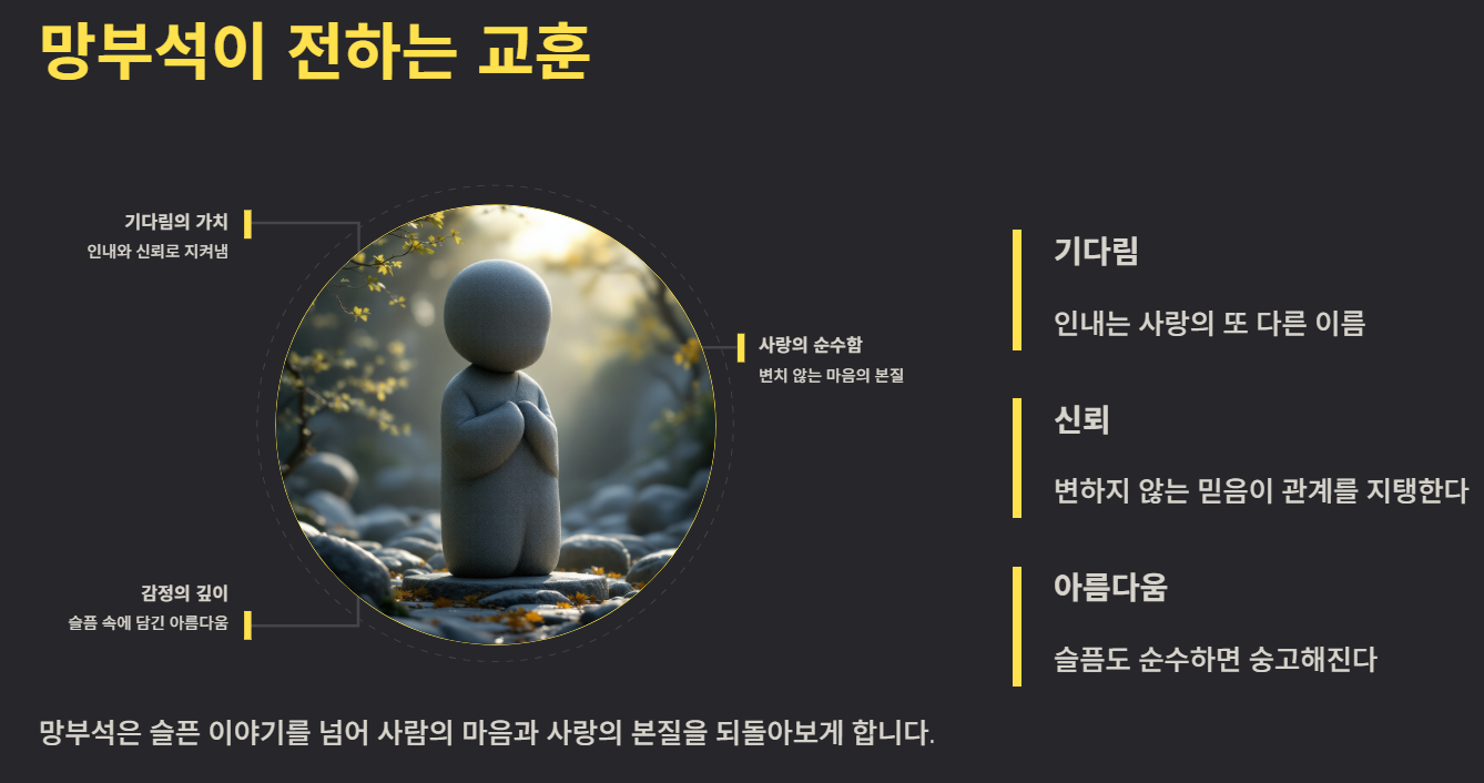 망부석 설화는 단순한 슬픈 이야기가 아니라 사람의 마음과 사랑의 가치를 생각하게 합니다. 또한 기다림과 신뢰, 그리고 변하지 않는 마음의 중요성을 전달하는 이야기로 해석되기도 합니다.