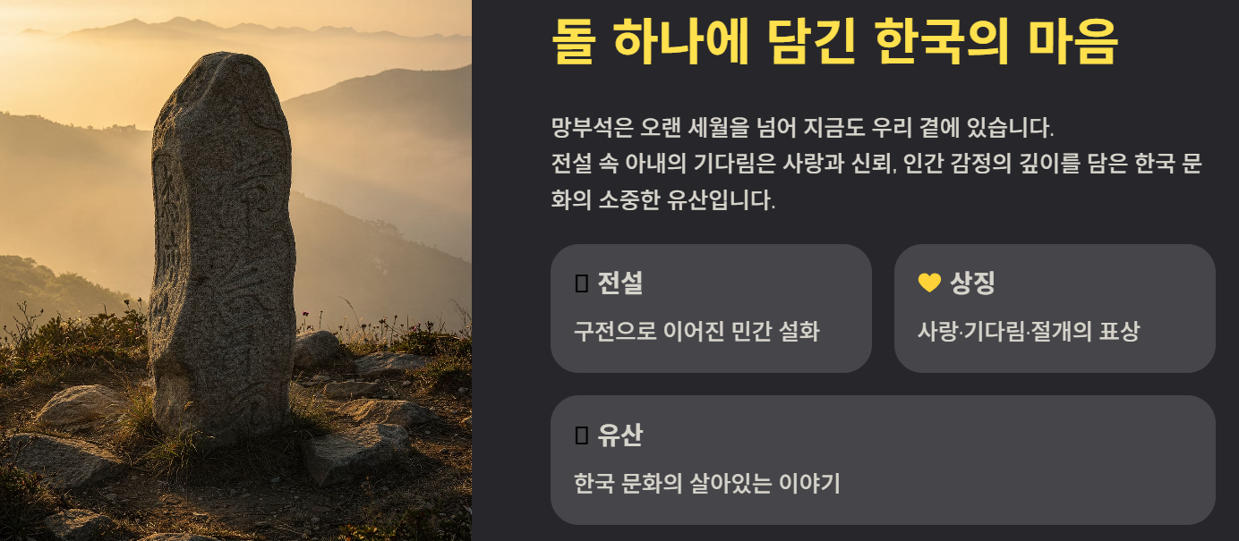 망부석은 단순한 돌이 아니라 오랜 세월 동안 전해 내려온 한국의 상징적인 전설입니다. 남편을 기다리는 아내의 이야기를 통해 사랑과 기다림, 그리고 인간의 감정을 표현하는 문화적 소재로 자리 잡았습니다. 오늘날에도 문학과 예술, 관광 이야기 속에서 망부석은 계속 언급되며 한국 문화의 한 부분으로 남아 있습니다. 이러한 전설을 이해하면 한국 전통 설화와 문화적 가치에 대해 더욱 깊이 알 수 있습니다.