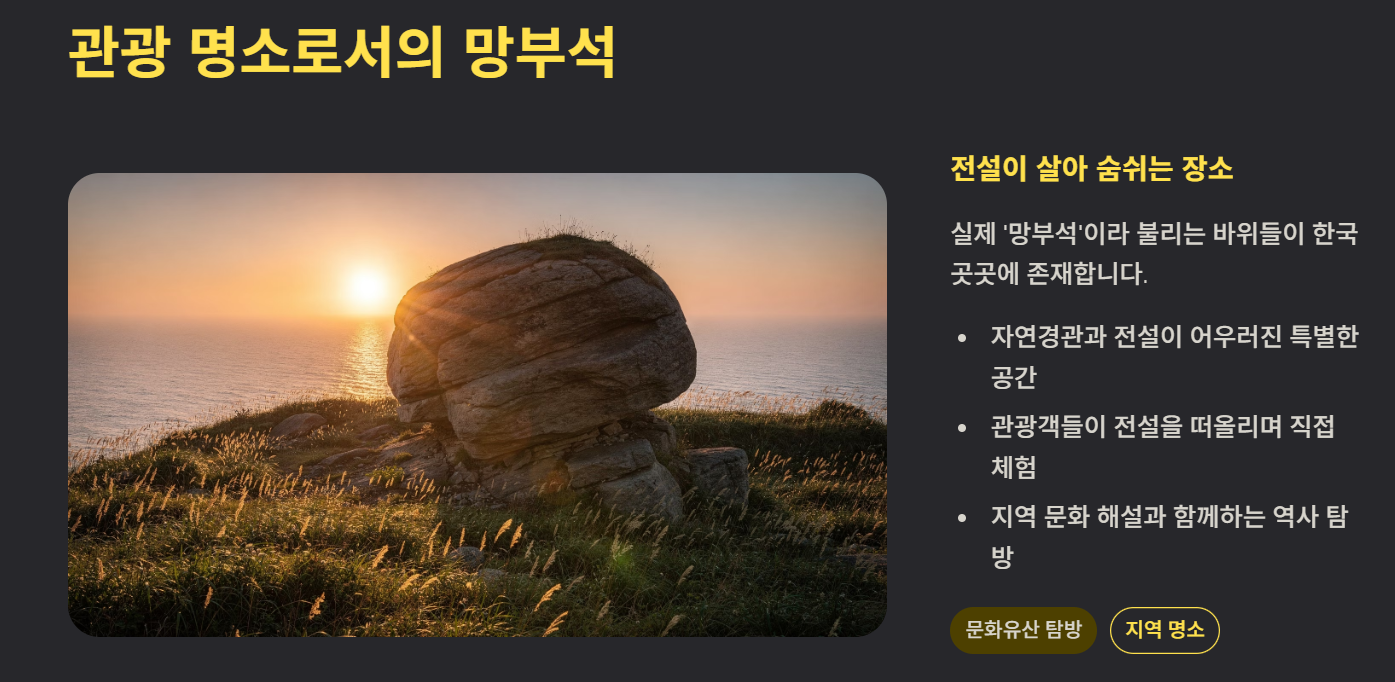 한국에는 실제로 ‘망부석’이라는 이름을 가진 바위들이 존재합니다. 많은 관광객들이 이러한 바위를 찾아 전설을 떠올리며 방문합니다. 자연경관과 함께 전설이 더해져 관광 명소로 발전한 곳도 있습니다.