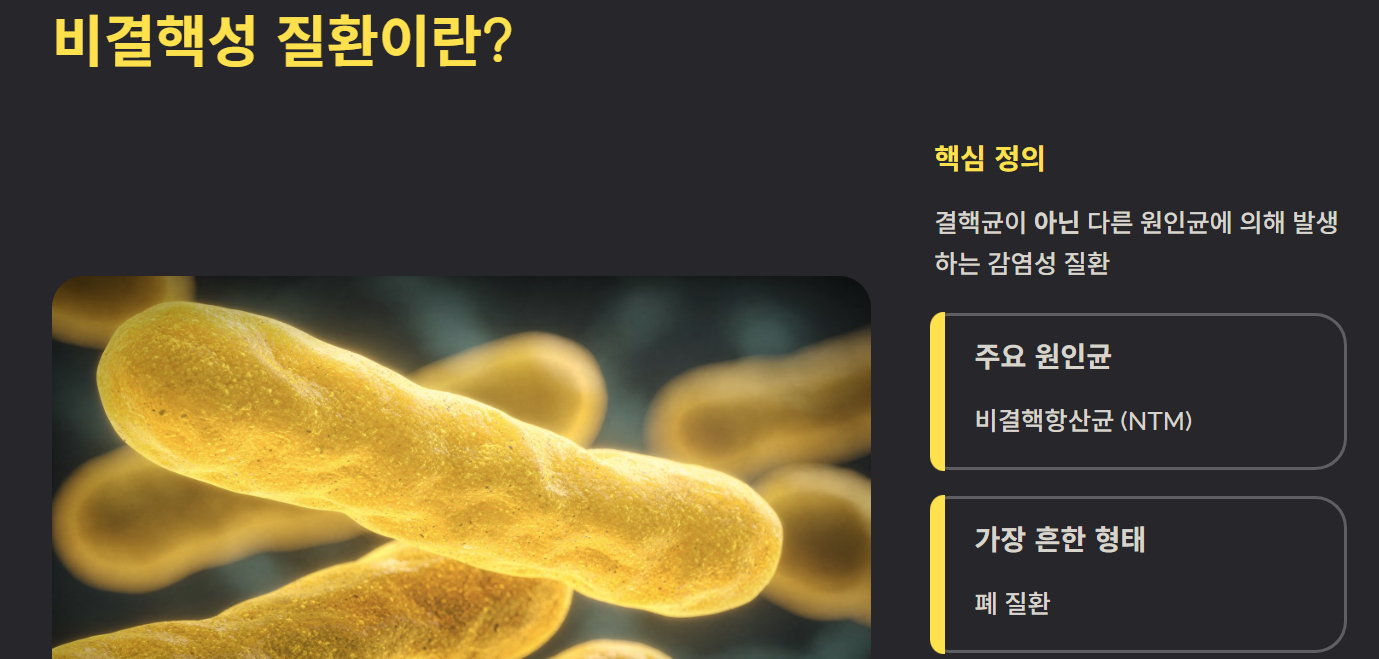 비결핵성 질환은 대표적으로 결핵균(결핵)이 아닌 다른 원인균에 의해 발생하는 감염성 질환을 의미합니다. 주로 비결핵항산균(NTM)에 의해 발생하며, 폐 질환 형태로 나타나는 경우가 많습니다.