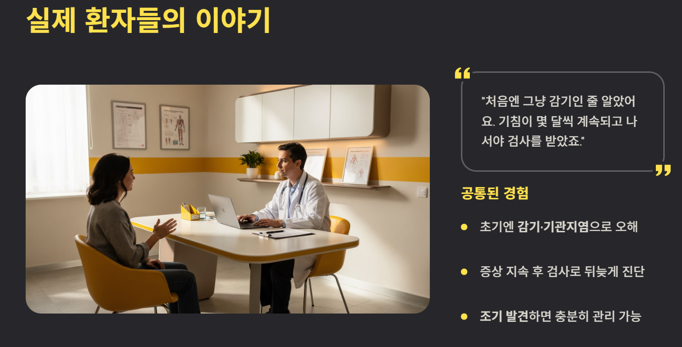 실제 환자들의 후기를 보면 초기에는 단순 감기나 기관지염으로 오해하는 경우가 많습니다. 그러나 증상이 지속되면서 검사를 통해 비결핵성 질환으로 진단되는 사례가 많습니다. 치료 기간이 길고 꾸준한 관리가 필요하지만, 조기에 발견하면 충분히 관리 가능한 질환이라는 점에서 정기적인 건강 체크가 중요하다는 의견이 많습니다.
