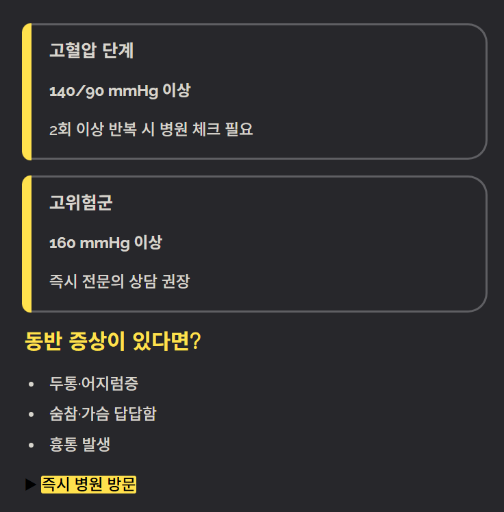 만약 140/90 이상이 2회 이상 반복된다면 고혈압으로 의심해 병원 체크가 좋습니다.