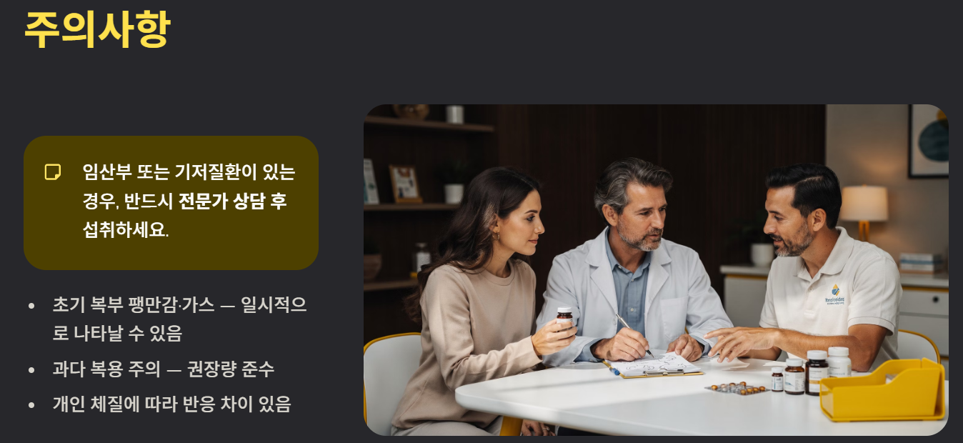또한 과다 복용은 피해야 하며, 임산부나 질환이 있는 경우 전문가 상담 후 섭취하는 것이 좋습니다.