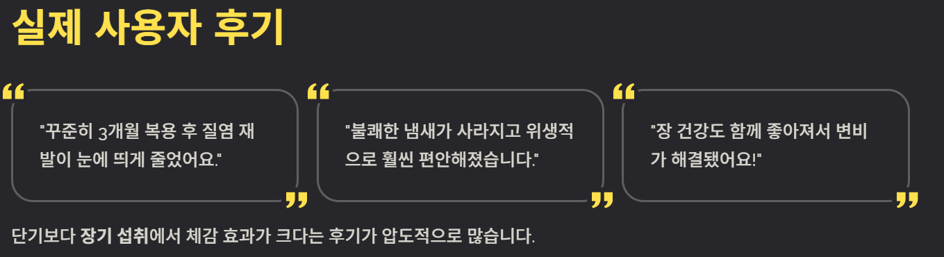 특히 꾸준히 복용한 경우 체감 효과가 크다는 후기가 많으며, 단기간보다는 장기 섭취가 중요하다는 의견이 많습니다.