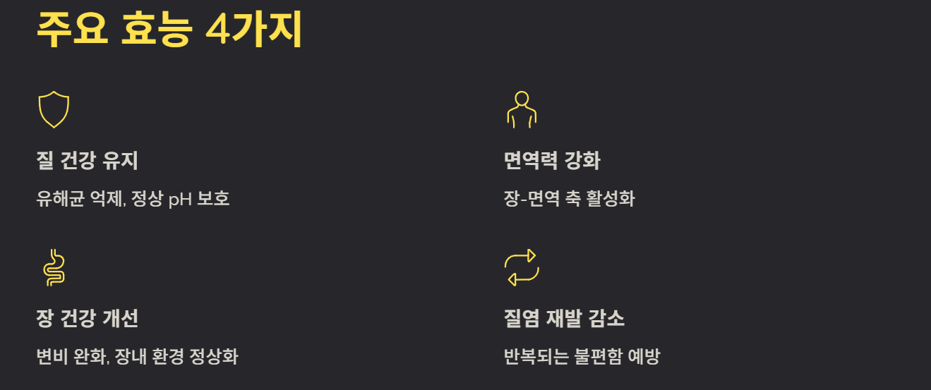 특히 질염 재발을 줄이는 데 도움을 줄 수 있어 꾸준한 섭취가 권장됩니다.