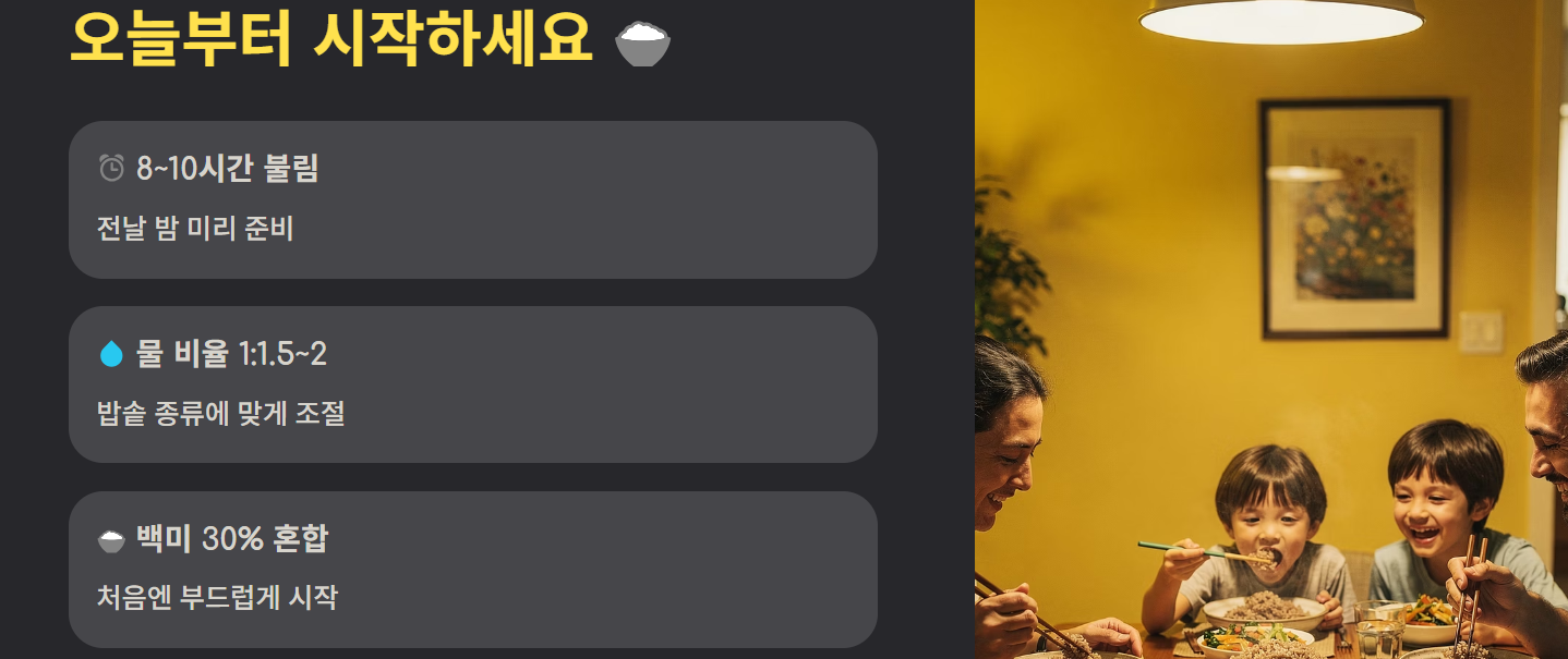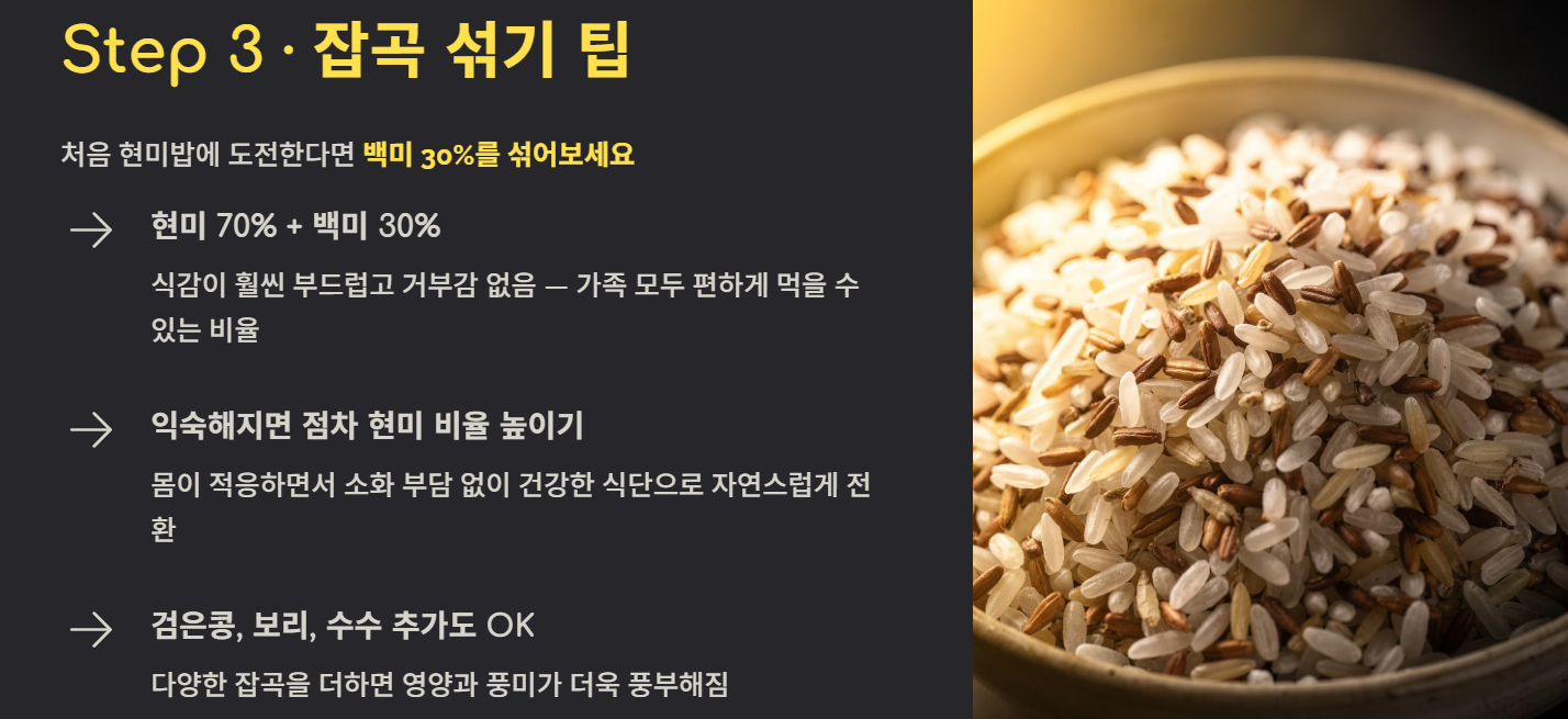 직접 현미밥을 여러 번 지어본 결과, 가장 중요한 것은 ‘불림 시간’과 ‘물 비율’이었습니다. 처음에는 딱딱하고 먹기 힘들었지만, 8시간 이상 불리고 압력밥솥을 사용하니 식감이 훨씬 좋아졌습니다. 특히 백미를 조금 섞었을 때 가족들도 부담 없이 잘 먹었습니다.