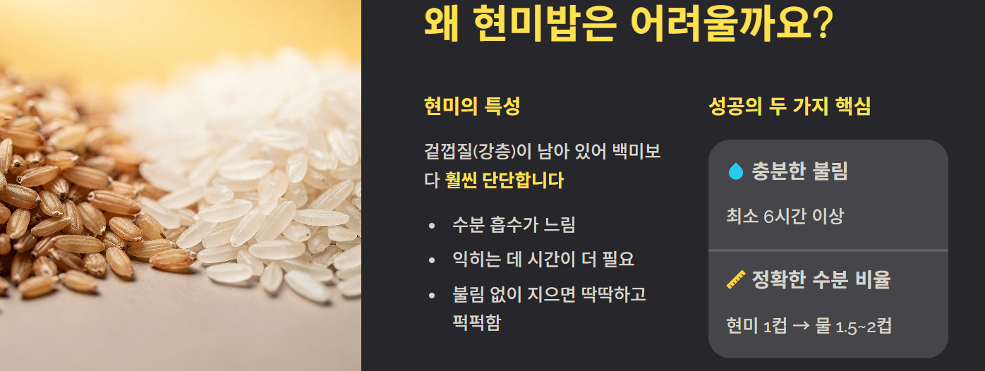 현미는 겉껍질이 남아 있어 백미보다 단단합니다. 이 때문에 충분한 수분과 시간이 없으면 밥이 딱딱하게 됩니다. 현미밥 맛있게 하는 법의 핵심은 바로 ‘불림’과 ‘수분 조절’입니다.