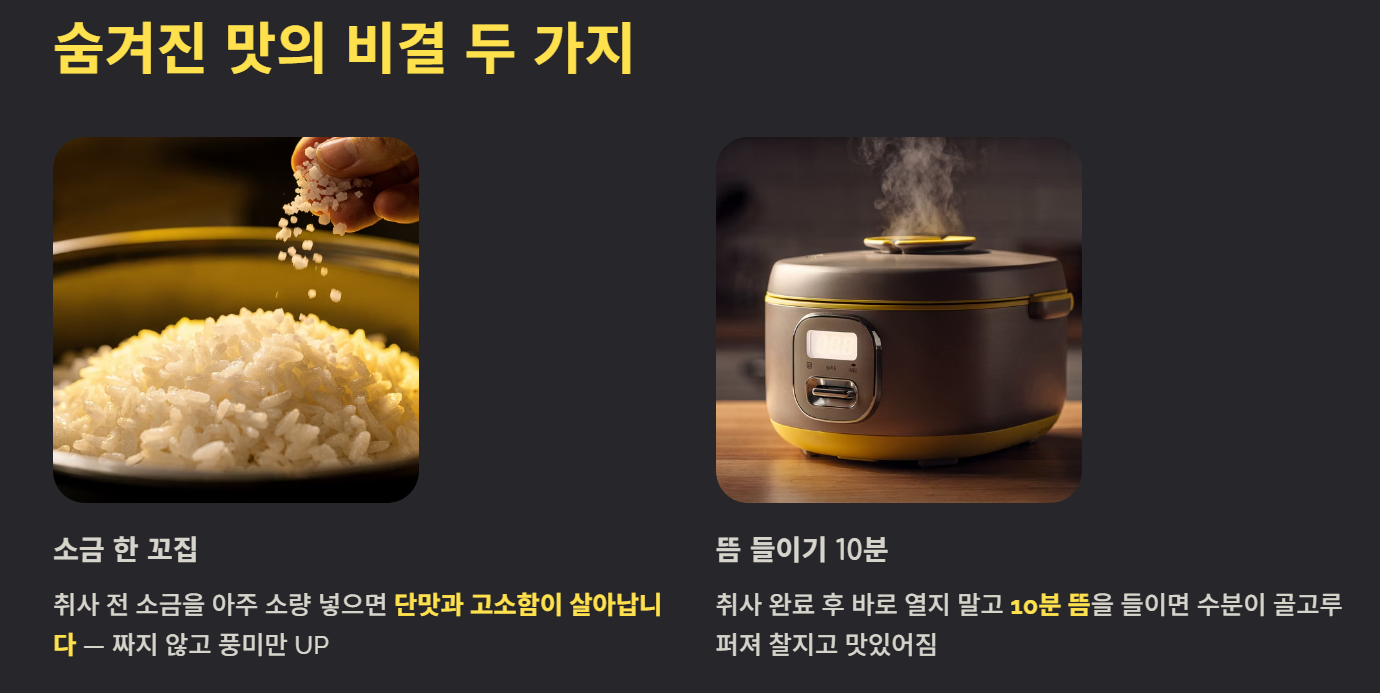 밥이 완성된 후 바로 먹지 말고 10분 정도 뜸을 들이면 수분이 골고루 퍼져 더 맛있어집니다. 이 과정은 절대 생략하지 않는 것이 좋습니다.
