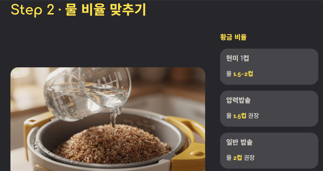 현미밥 맛있게 하는 법에서 가장 중요한 부분은 물 비율입니다. 일반적으로 현미 1컵 기준 물 1.5~2컵이 적당합니다. 밥솥 종류에 따라 조금씩 조절하면 더 좋습니다.
