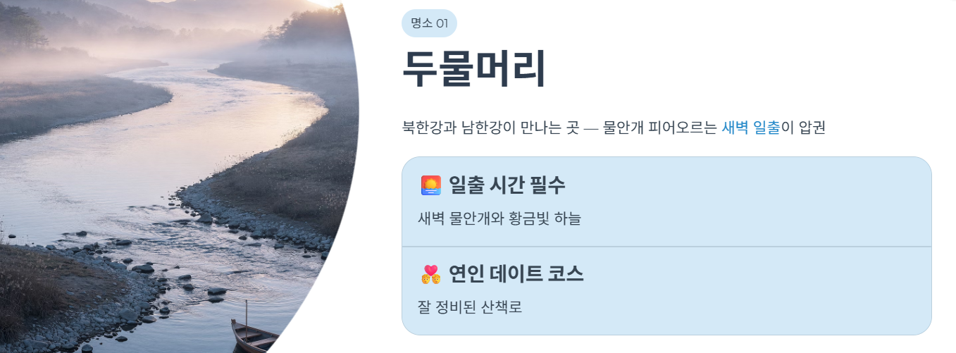 두물머리는 북한강과 남한강이 만나는 곳으로, 양평에서 가장 유명한 관광지입니다. 물안개가 피어오르는 새벽 풍경은 특히 아름다워 사진 촬영지로 인기가 높습니다. 산책로도 잘 정비되어 있어 여유로운 힐링을 즐기기 좋습니다.