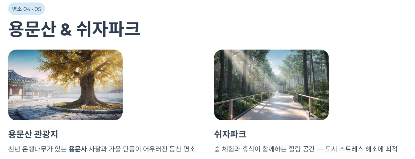 용문산은 등산과 자연휴양을 동시에 즐길 수 있는 대표 명소입니다. 특히 천년 은행나무로 유명한 용문사도 함께 방문할 수 있습니다.