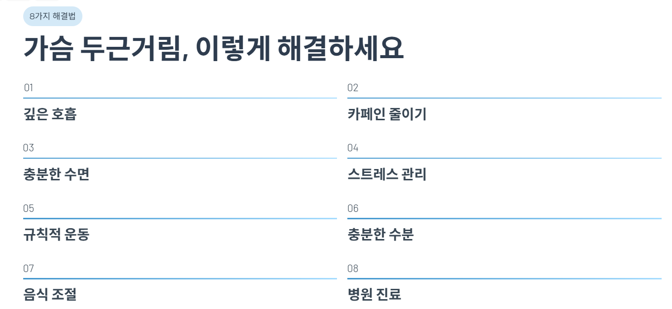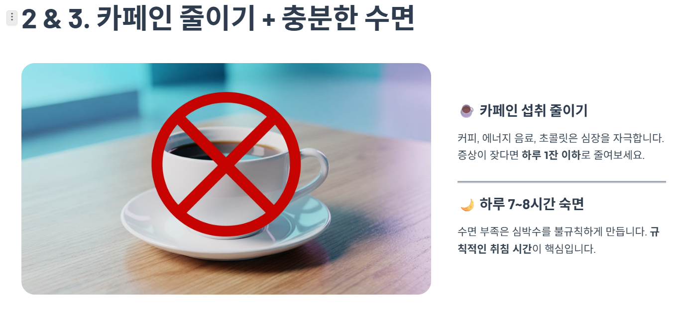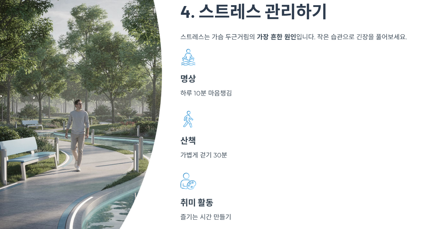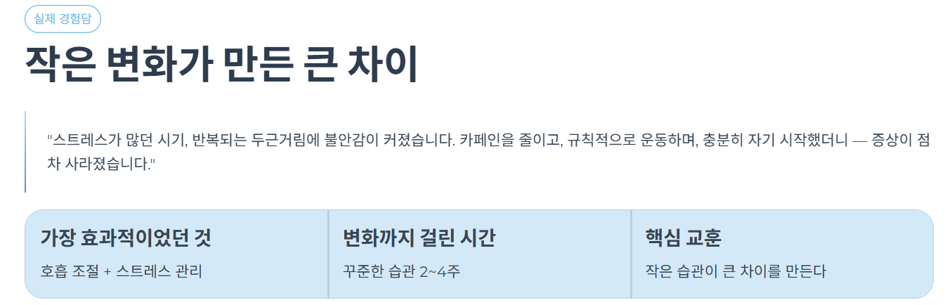 저 역시 스트레스가 많던 시기에 가슴 두근거림을 자주 겪었습니다. 처음에는 단순 피로라고 생각했지만, 증상이 반복되면서 불안감이 커졌습니다. 이후 카페인을 줄이고, 규칙적으로 운동하며, 잠을 충분히 자는 생활습관으로 바꾸었더니 점차 증상이 줄어들었습니다. 특히 호흡 조절과 스트레스 관리가 가장 큰 도움이 되었습니다. 작은 습관 변화가 큰 차이를 만든다는 것을 직접 느꼈습니다.