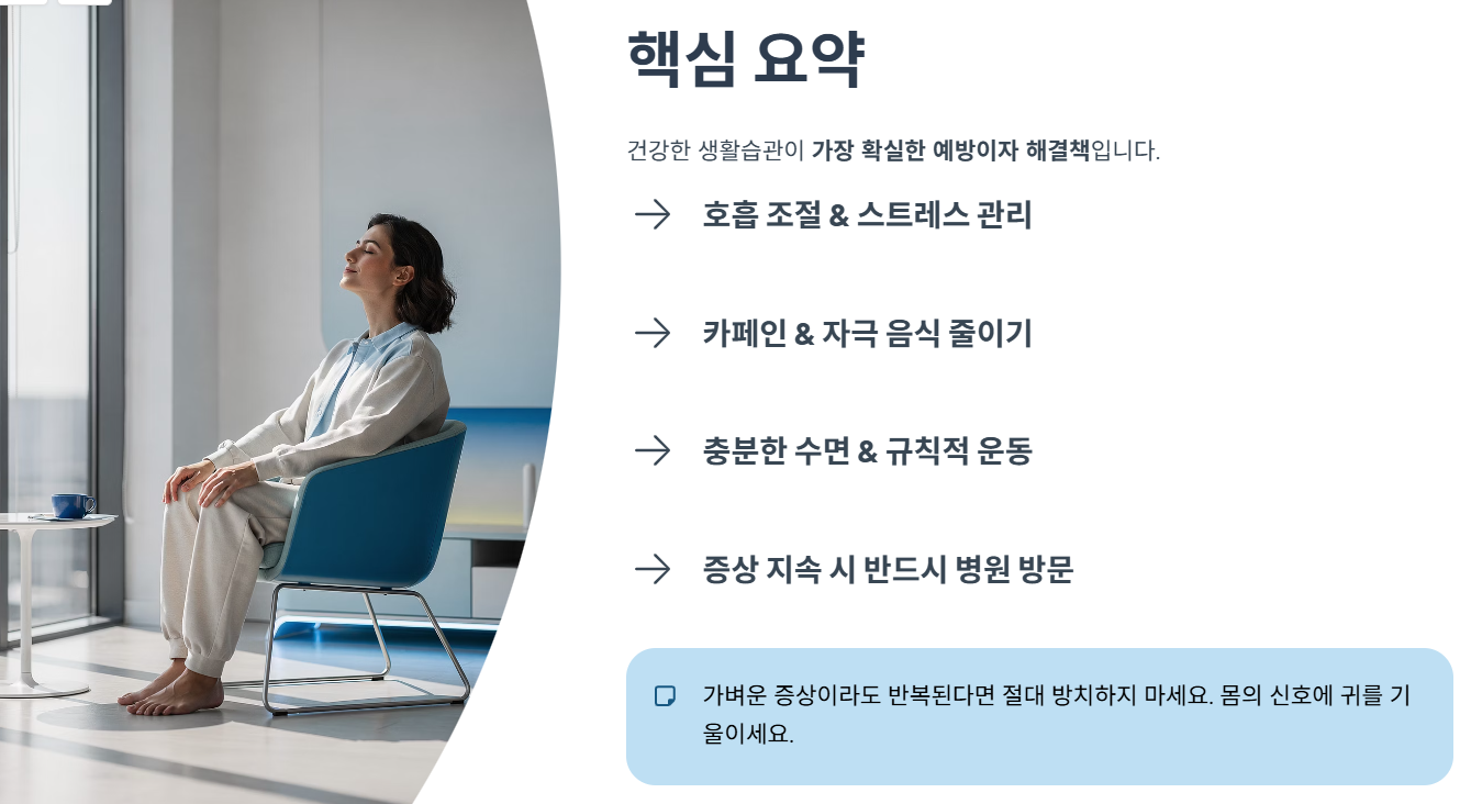 가벼운 증상이라도 반복된다면 절대 방치하지 말고 몸의 신호를 잘 살펴보는 것이 중요합니다. 건강한 생활습관이 가장 확실한 예방이자 해결책입니다.
