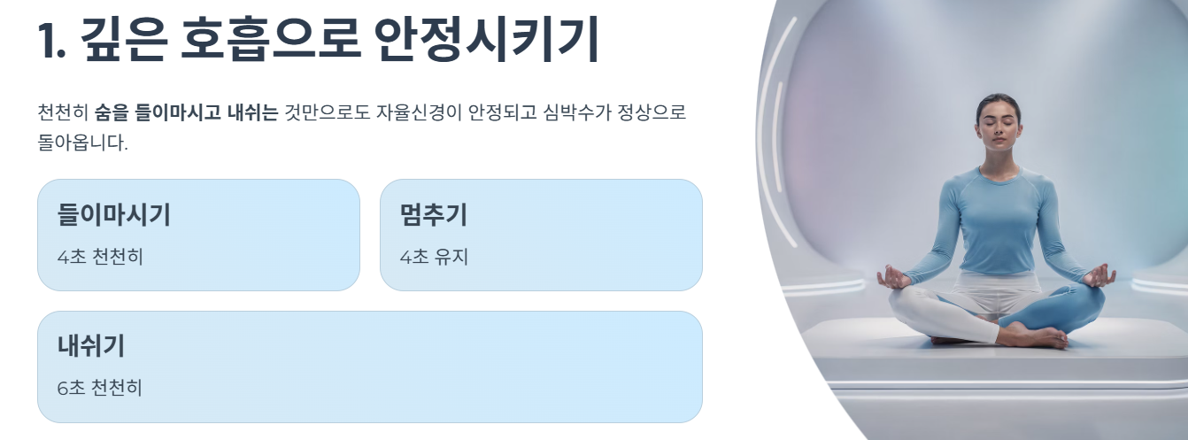 가장 간단하면서 효과적인 방법은 호흡 조절입니다. 천천히 깊게 숨을 들이마시고 내쉬는 것을 반복하면 자율신경이 안정되면서 심박수도 점차 정상으로 돌아옵니다.