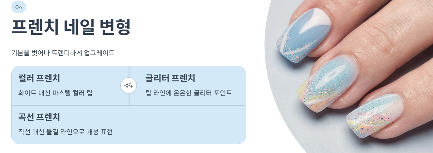 기본 프렌치 네일에서 벗어나 컬러 프렌치나 글리터 프렌치로 변형하면 트렌디한 느낌을 살릴 수 있습니다. 과하지 않으면서도 포인트가 되는 디자인입니다.
