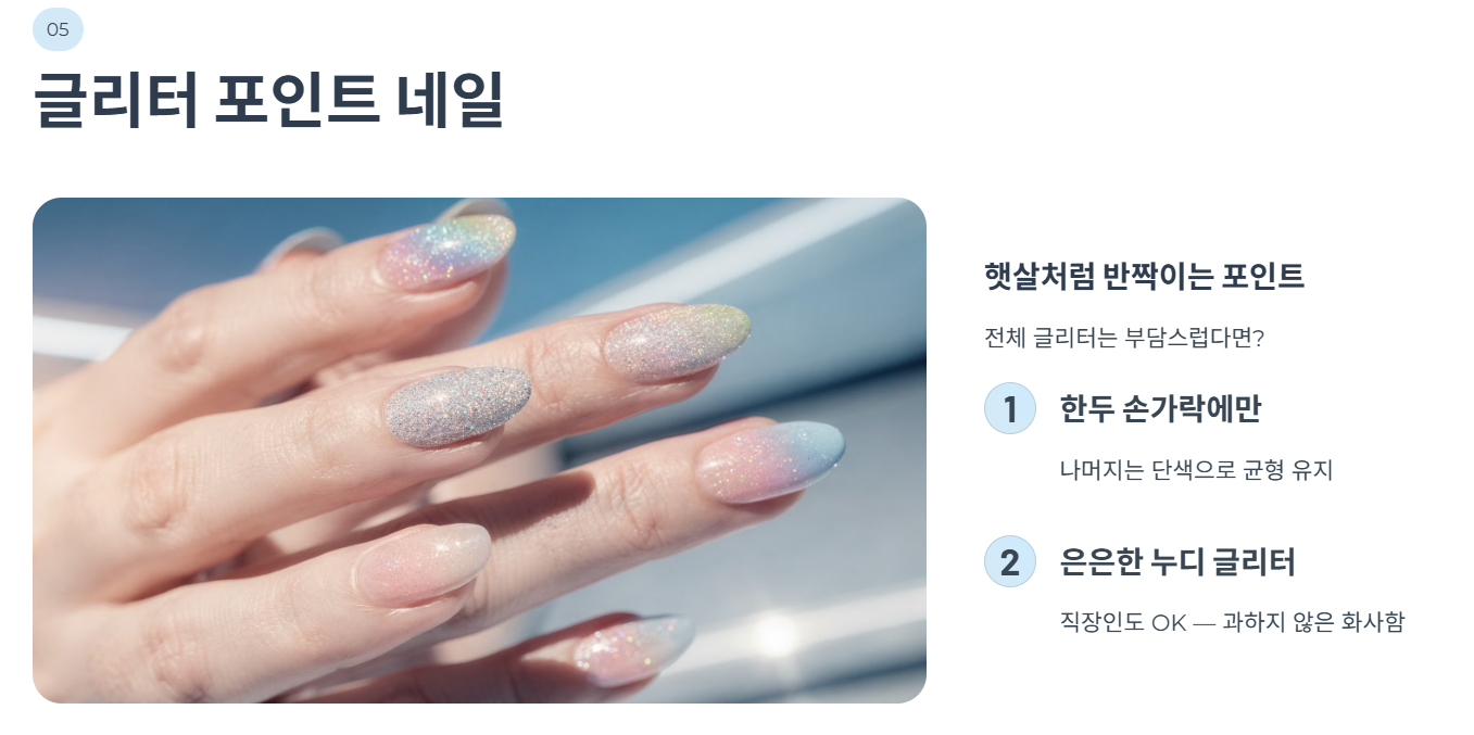 햇살이 반짝이는 봄에는 은은한 글리터를 활용해 보세요. 전체가 아닌 한두 손가락에만 포인트로 넣으면 부담 없이 화사함을 더할 수 있습니다.