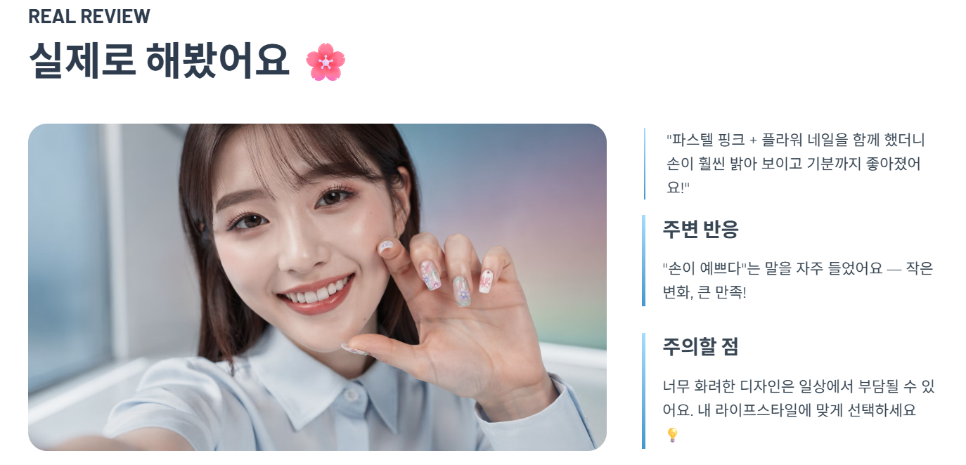 봄 시즌에 파스텔 핑크와 플라워 네일을 함께 시도해본 결과, 손이 훨씬 밝아 보이고 기분까지 좋아지는 느낌을 받았습니다. 특히 주변에서 “손이 예쁘다”는 말을 많이 들으면서 작은 변화지만 큰 만족을 느낄 수 있었습니다. 반대로 너무 화려한 디자인은 일상에서 부담스러울 수 있으니 본인의 스타일과 상황에 맞게 선택하는 것이 중요합니다.