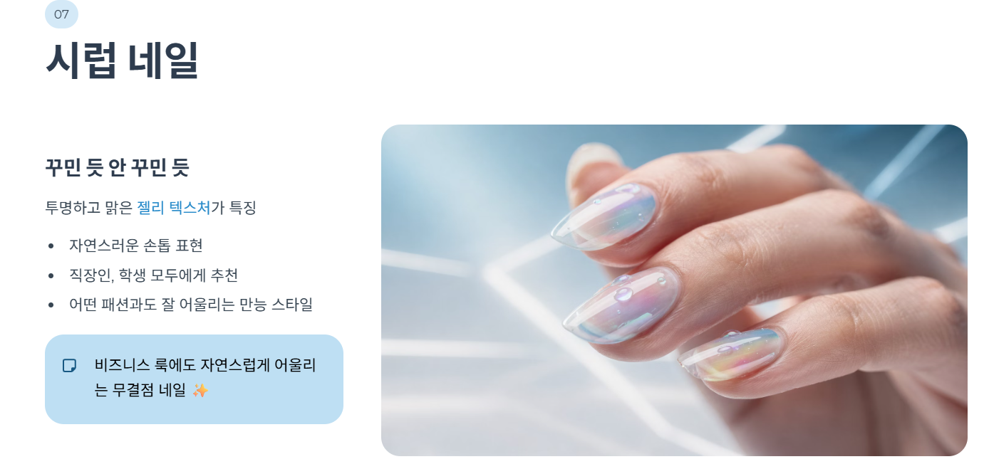 투명하고 맑은 느낌의 시럽 네일은 자연스러운 손톱 표현을 원할 때 좋습니다. 꾸민 듯 안 꾸민 듯한 느낌으로 직장인에게 특히 추천됩니다.