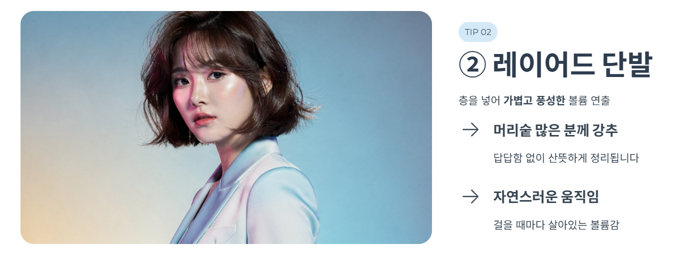 층을 넣은 레이어드 단발은 머리가 가벼워 보이고 볼륨이 살아납니다.