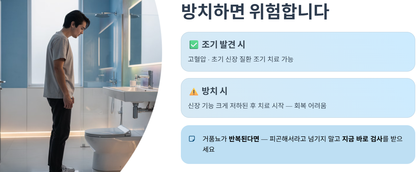 아침에 화장실을 갔는데 소변에 유난히 거품이 많고 오래 사라지지 않는다면 걱정이 될 수 있습니다. 많은 사람들이 피곤해서 그렇겠지, 물을 적게 마셔서 그렇겠지 하고 넘기지만, 반복적으로 나타나는 단백뇨는 신장이 보내는 중요한 신호일 수 있습니다.