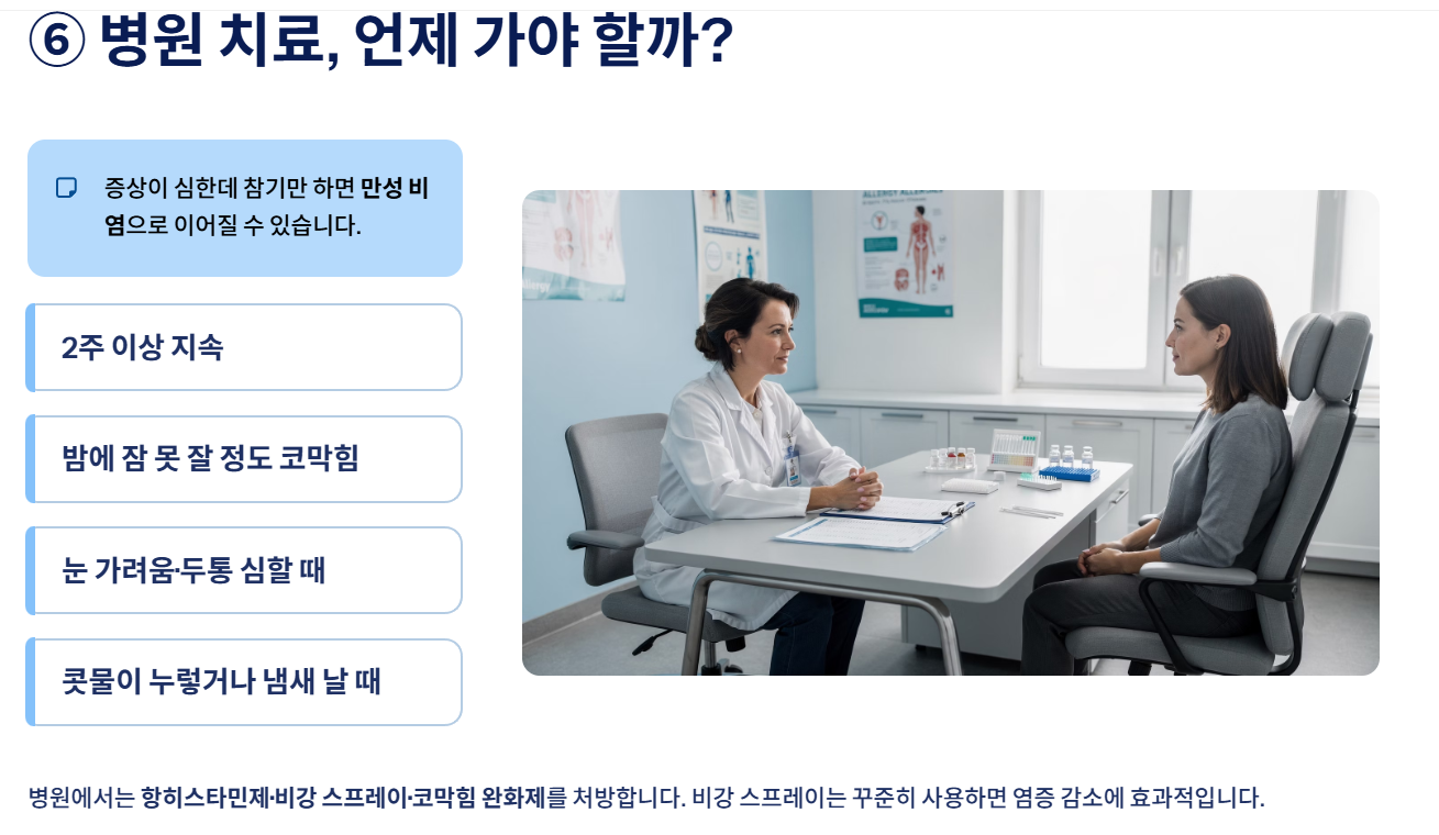 병원에서는 항히스타민제, 비강 스프레이, 코막힘 완화제를 처방하기도 합니다. 특히 비강 스프레이는 꾸준히 사용하면 염증을 줄이는 데 효과적입니다.
