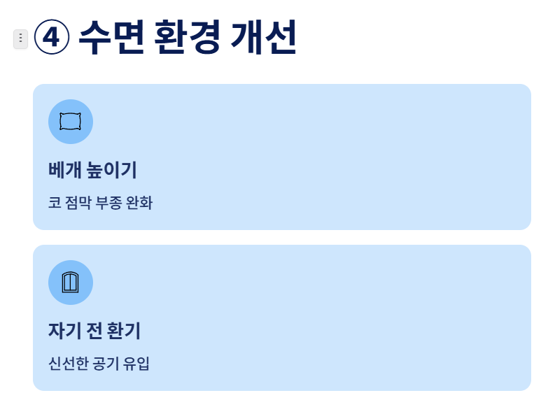 밤에 코가 막혀 입으로 숨 쉬면 목이 아프고 숙면을 취하기 어려워집니다. 수면 환경을 바꾸는 것만으로도 아침 증상이 줄어드는 경우가 많습니다.