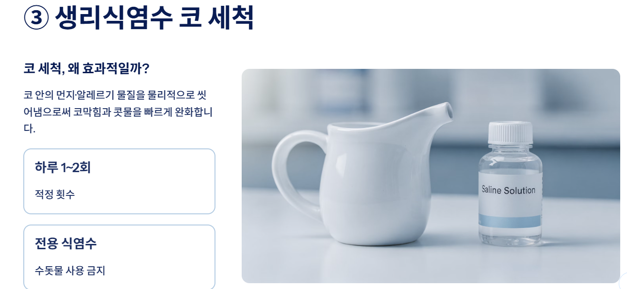 코 안에 들어간 먼지와 알레르기 물질을 씻어내는 가장 쉬운 방법이 코 세척입니다. 생리식염수를 사용해 하루 1~2회 정도 코를 씻어주면 코막힘과 콧물이 완화될 수 있습니다.