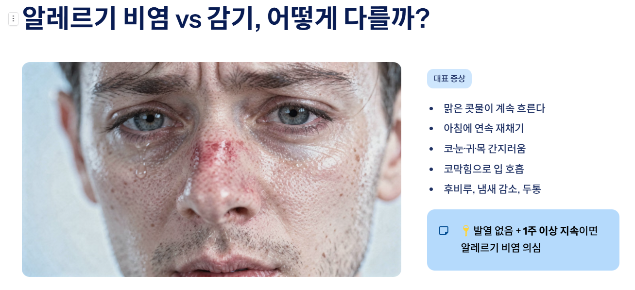 감기와 가장 큰 차이는 발열이 거의 없고, 증상이 1주 이상 반복된다는 점입니다. 특히 아침에 심하고, 외출 후나 청소 후 더 심해진다면 알레르기 비염일 가능성이 큽니다.