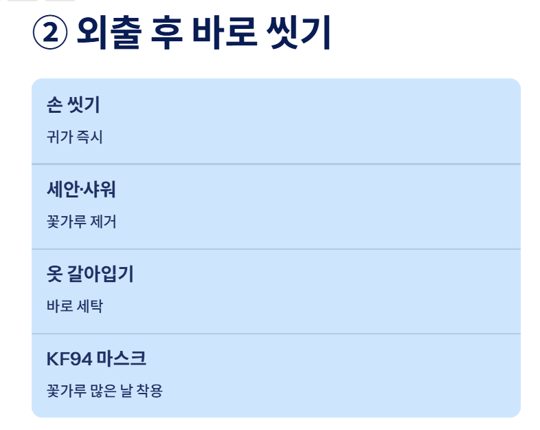 특히 꽃가루가 많은 날에는 KF94 마스크를 착용하면 재채기와 콧물 증상을 줄이는 데 도움이 됩니다.