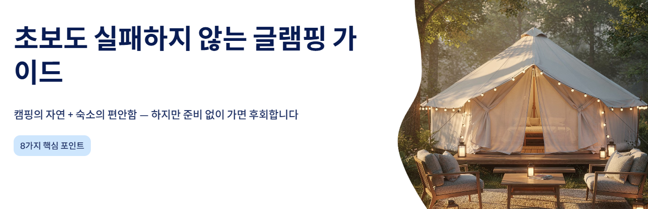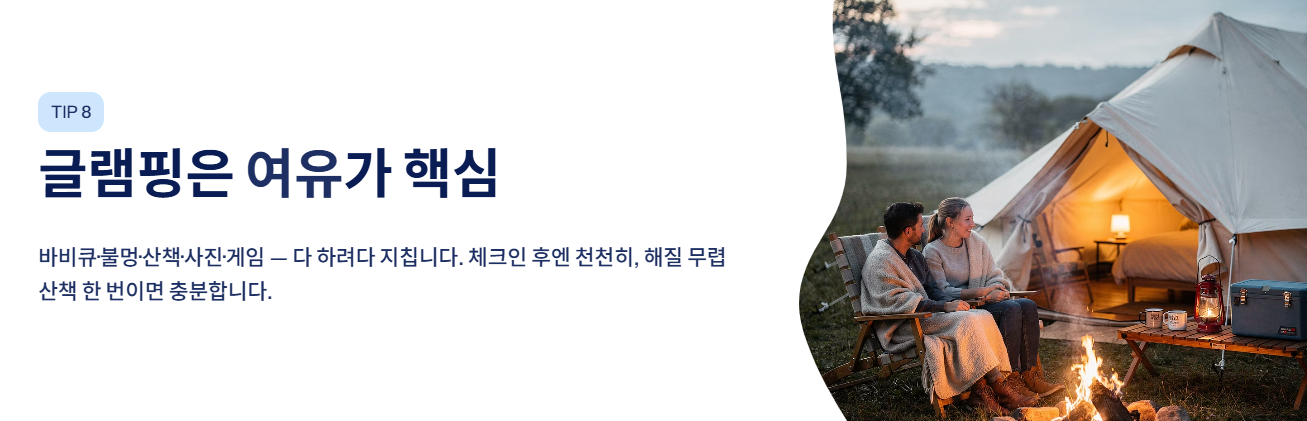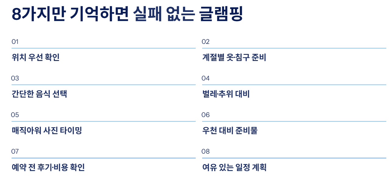 글램핑은 캠핑보다 편하지만, 아무 준비 없이 가면 생각보다 불편할 수 있습니다. 장소 선택, 계절별 옷차림, 음식, 벌레 대비, 추가 비용 확인만 잘해도 만족도가 크게 높아집니다.