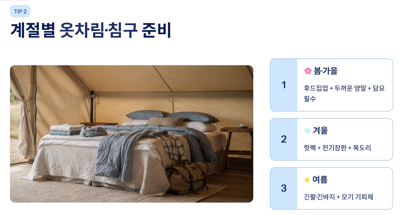 봄과 가을에는 얇은 겉옷만 챙기면 춥다고 느끼기 쉽습니다. 반드시 후드집업, 두꺼운 양말, 담요를 준비하는 것이 좋습니다. 겨울 글램핑이라면 핫팩, 전기장판, 목도리까지 챙기는 것이 도움이 됩니다.