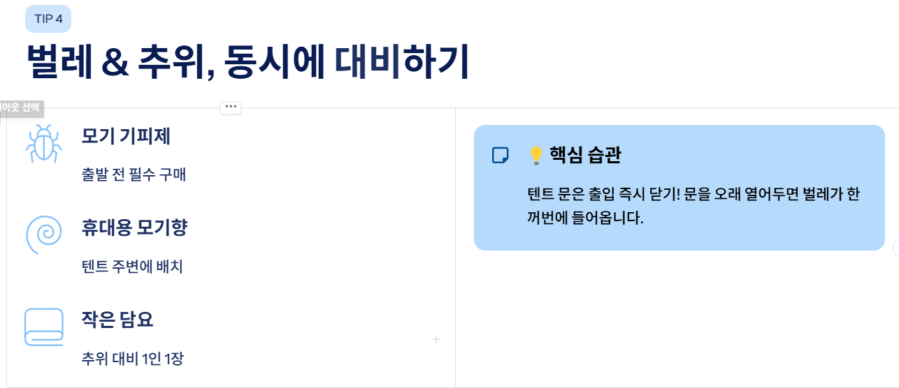 또한 텐트 문을 오래 열어두면 벌레가 한꺼번에 들어오기 때문에, 출입할 때마다 바로 닫는 습관이 중요합니다.