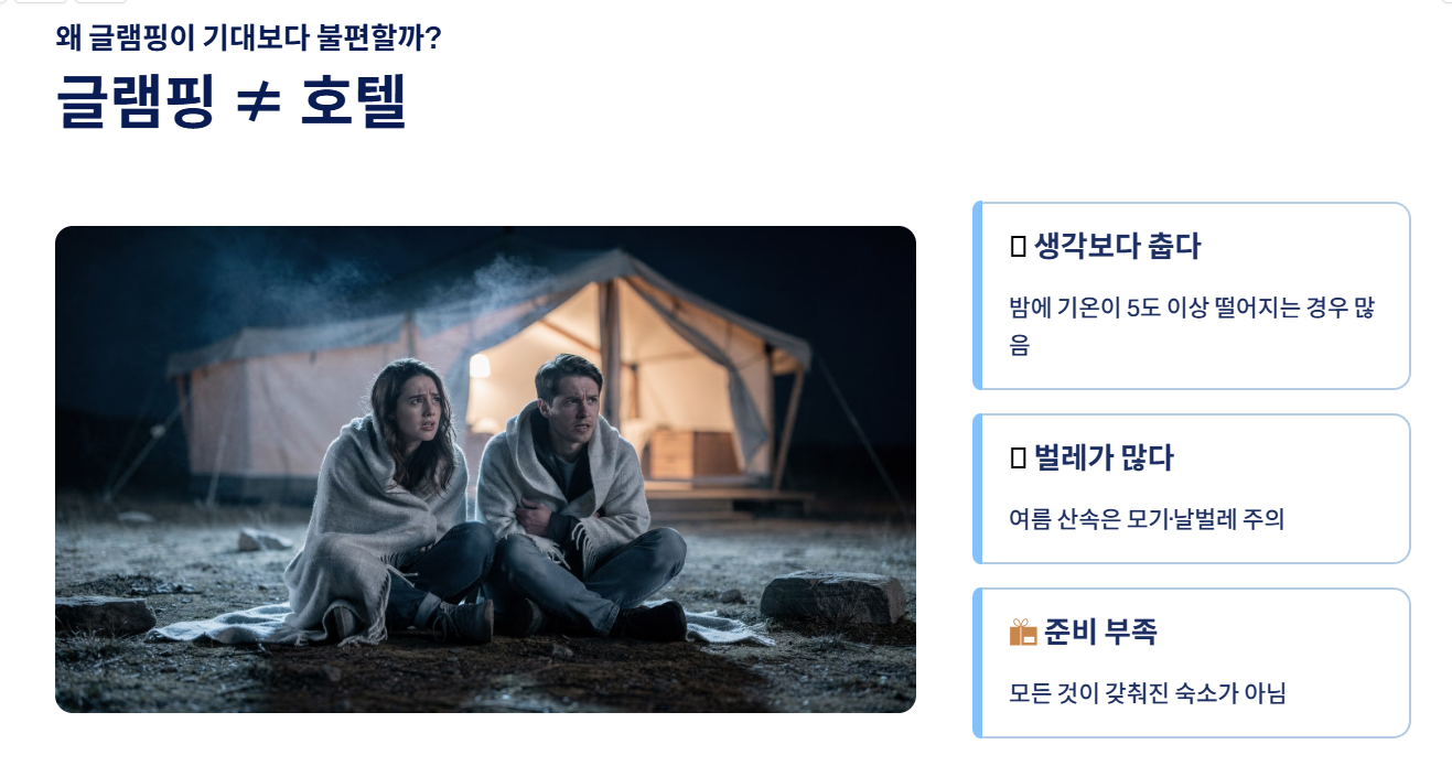글램핑은 실내 숙소처럼 보이지만, 실제로는 외부 공기의 영향을 많이 받습니다. 특히 밤에는 기온이 5도 이상 떨어지는 경우가 많습니다.