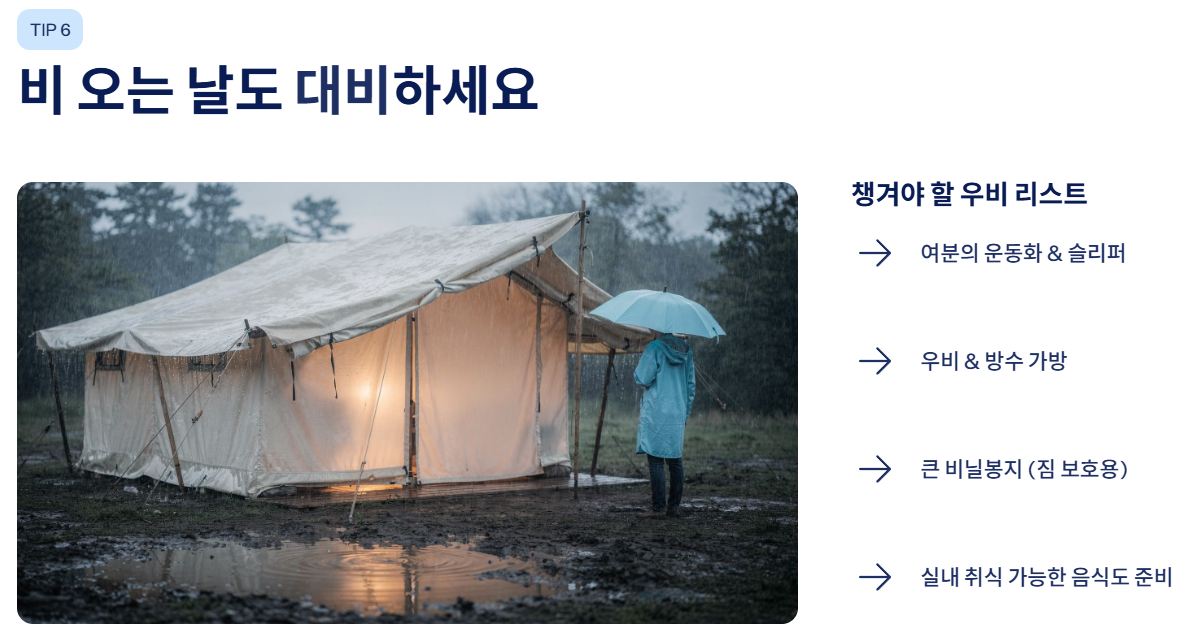 글램핑은 날씨 영향을 크게 받기 때문에, 비가 오면 생각보다 불편할 수 있습니다. 특히 신발이 젖거나, 바닥이 축축해지면 여행 만족도가 떨어집니다.