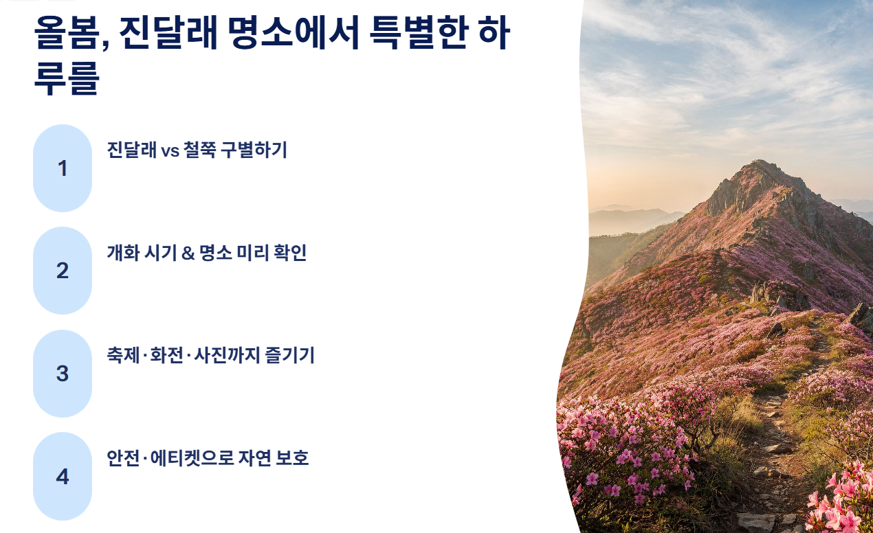 진달래는 봄을 대표하는 아름다운 꽃이지만, 제대로 알고 즐겨야 더욱 특별한 추억이 된다. 진달래와 철쭉의 차이를 알고, 개화 시기와 명소를 미리 확인하며, 축제와 화전 만들기까지 함께 즐겨보자.