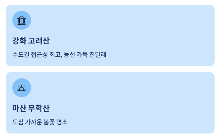 대표적인 진달래 축제로는 고려산 진달래 축제, 영취산 진달래 축제 등이 있다. 축제 기간에는 교통 통제나 셔틀버스가 운영되는 경우도 많아 미리 확인하면 더욱 편리하다.