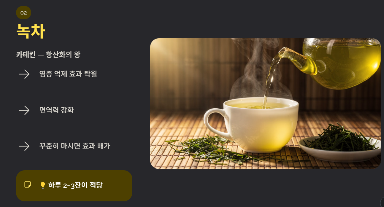 녹차 속 카테킨 성분은 항산화 효과가 뛰어나 염증을 억제합니다.