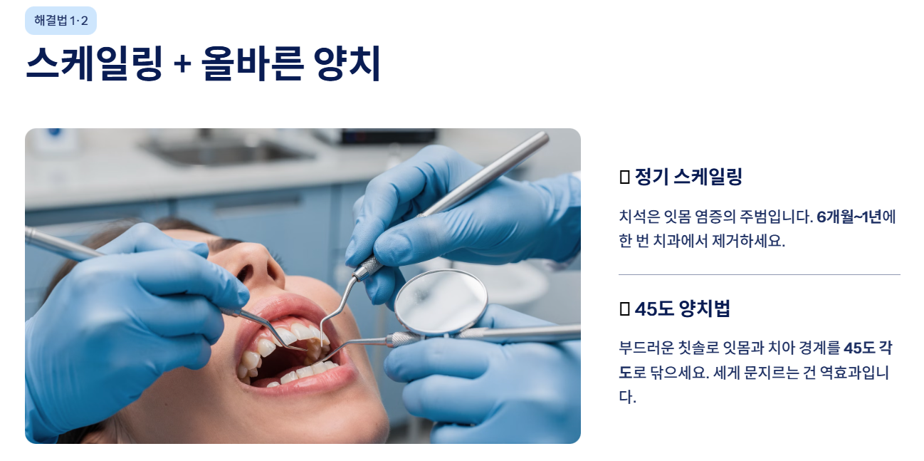 치석은 잇몸 염증의 주된 원인입니다. 치과에서 정기적으로 스케일링을 받으면 세균 번식을 억제하고 잇몸 건강을 유지할 수 있습니다. 최소 6개월~1년에 한 번은 필수입니다.