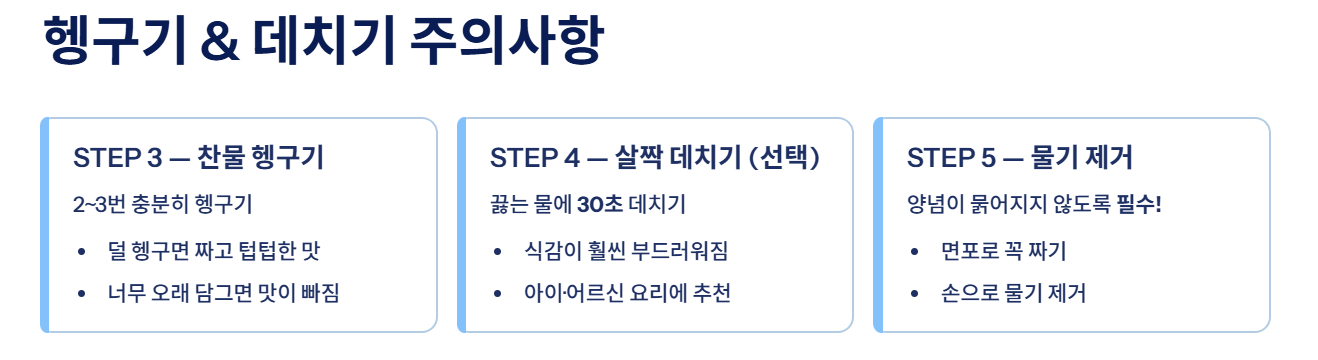 - 덜 헹구면 짜고 텁텁한 맛 발생