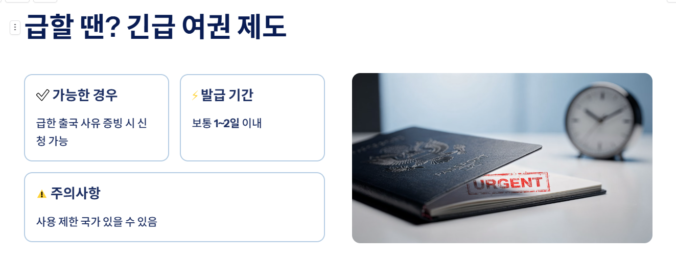 급한 출국 사유가 있는 경우 “긴급 여권” 신청이 가능합니다. 보통 1~2일 내 발급되지만, 사용 제한 국가가 있을 수 있으니 반드시 확인해야 합니다.