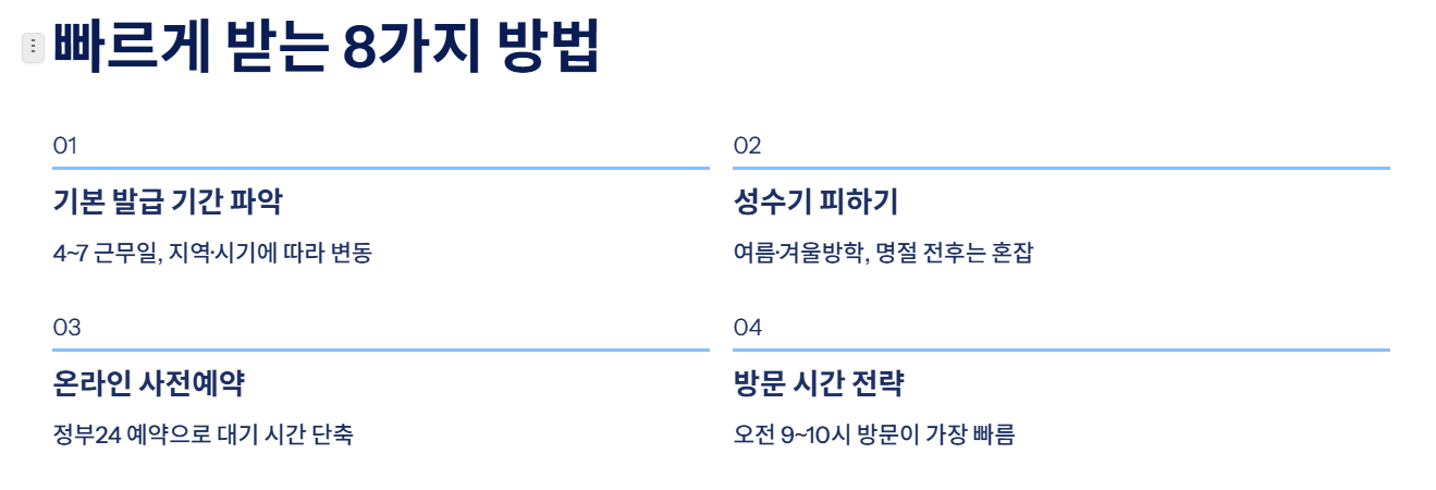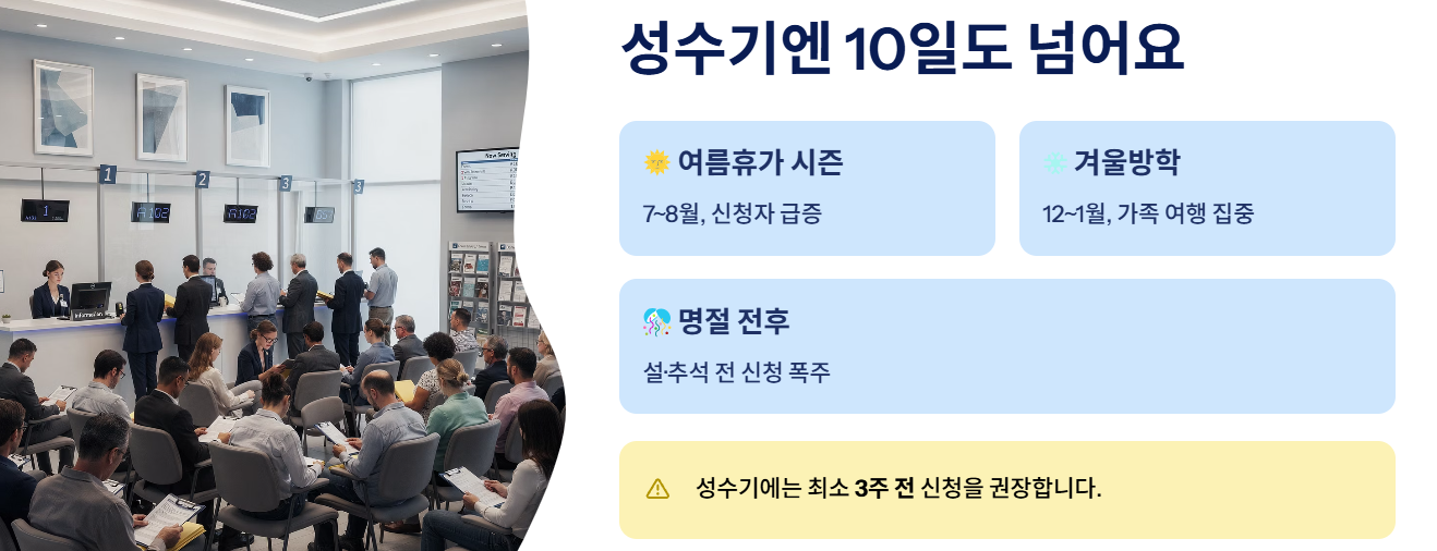 여름휴가, 겨울방학, 명절 전후에는 신청자가 몰려 발급 기간이 최대 10일 이상까지 늘어날 수 있습니다. 여행 계획이 있다면 최소 2~3주 전에 신청하는 것이 안전합니다.