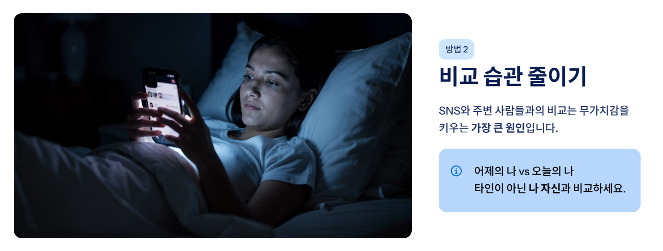 SNS나 주변 사람들과의 비교는 무가치함을 키우는 가장 큰 원인입니다. 비교 대신 어제의 나와 오늘의 나를 비교해보세요.