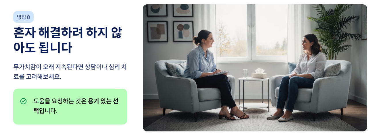 감정이 오래 지속된다면 상담이나 심리 치료도 좋은 방법입니다. 혼자 해결하려고만 하지 않아도 됩니다.