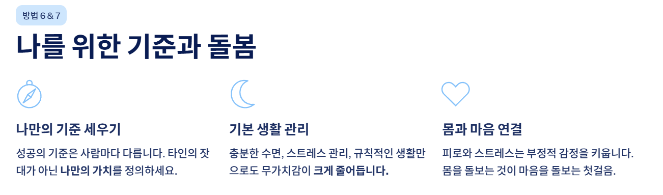 수면 부족, 스트레스, 피로는 부정적인 감정을 키웁니다. 기본적인 생활 관리만으로도 무가치감이 크게 줄어듭니다.